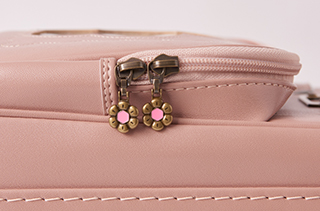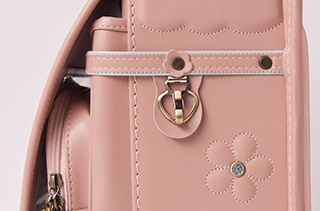 かぶせには可愛いお花鋲。ファスナー引き手もお花モチーフ。