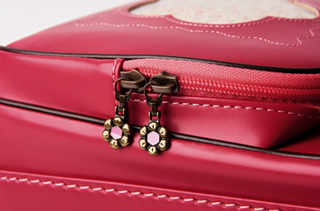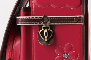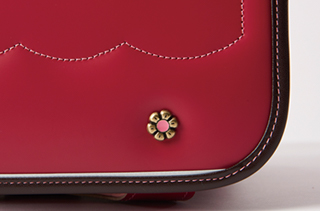 かぶせには可愛いお花鋲。ファスナー引き手もお花モチーフ。