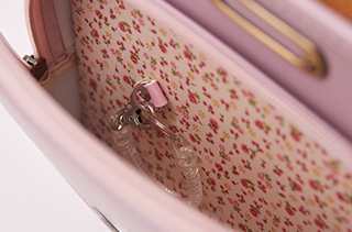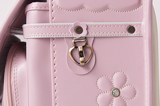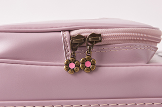 かぶせには可愛いお花鋲。ファスナー引き手もお花モチーフ。